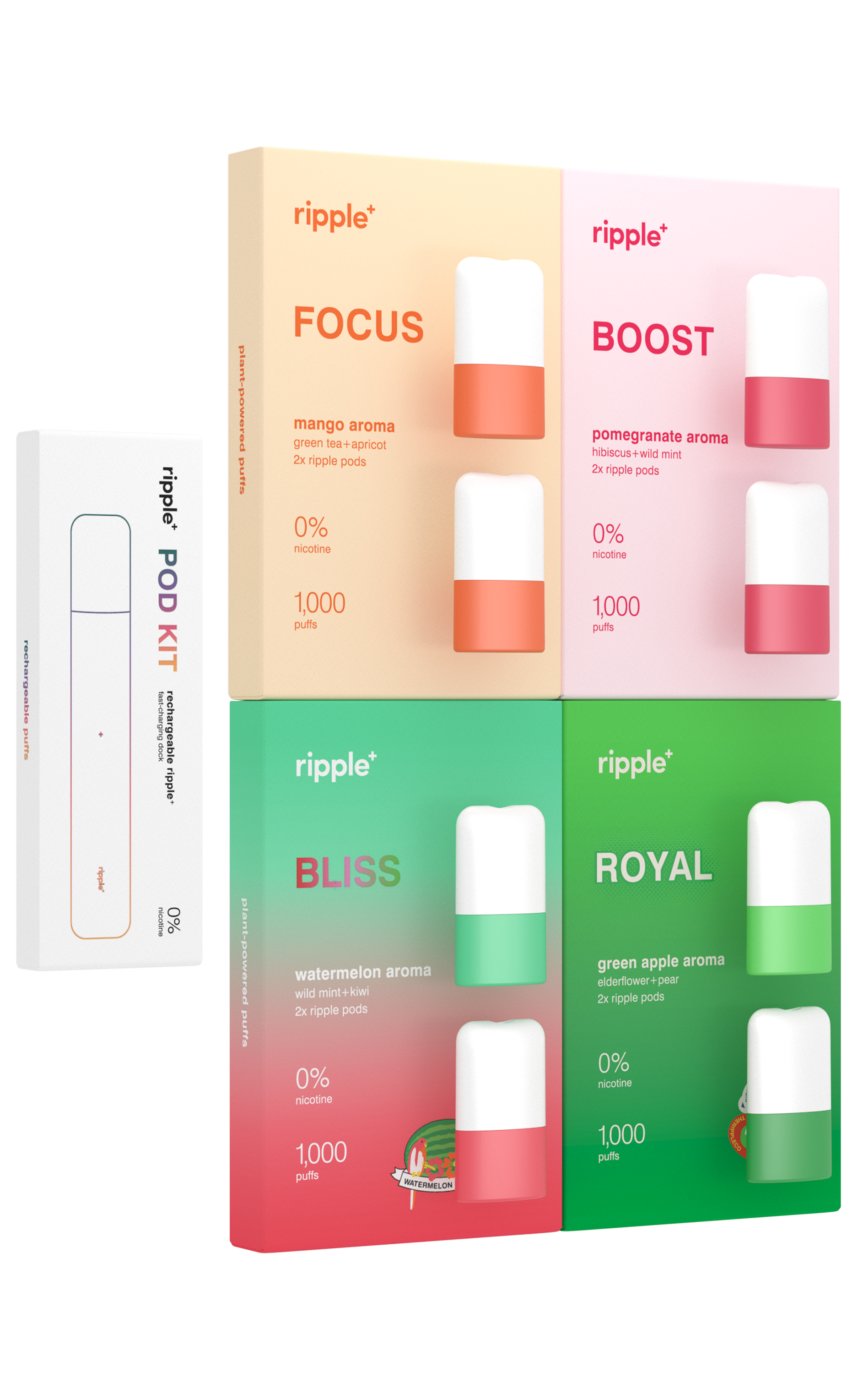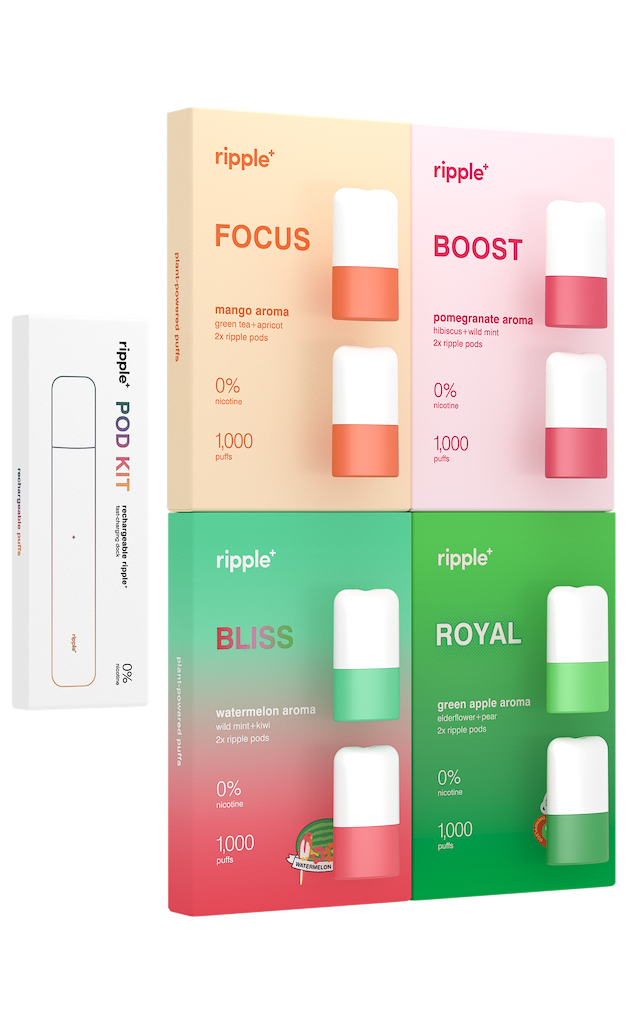 Each ripple⁺ pod will deliver 500 puffs (each pack contains 2x pods), meaning you get multiple days & weeks of plant-powered goodness. You know where to find us when you need a new batch!